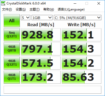 通過CrystalDiskMark測試得出硬盤的讀寫數(shù)據(jù)分別達(dá)到了 928.8MB/s和152.1MB/s,而不使用傲騰內(nèi)存的情況下,其讀寫都只有150MB/s左右。讀取速度提升了6.2倍。相比傳統(tǒng)機(jī)械硬盤讀取速度上有了質(zhì)的飛躍,而4k讀寫數(shù)據(jù)更是驚人,在日常使用中的體驗(yàn)提升更為巨大。