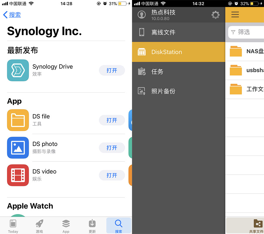 NAS最重要的是便捷性,其在何時何地均可使用,我們在App Store中搜索Synology Inc.可以看到群暉開發了數量眾多的應用,其中包括App,Apple Watch以及Apple TV三個類別。其中我們選取常用的DS file進行使用。DS file頁面簡單明了,可以使用此APP將手機照片備份到NAS中,也可以在App中上傳下載瀏覽以及分享NAS中的文件。