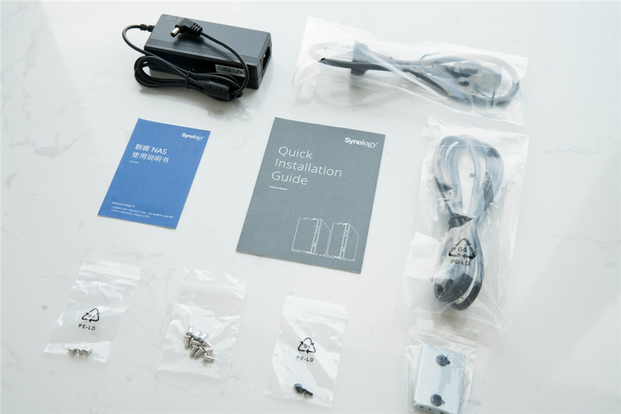 在配件方面,群暉配置了電源適配器,電源線,網線,以及四包小零件。