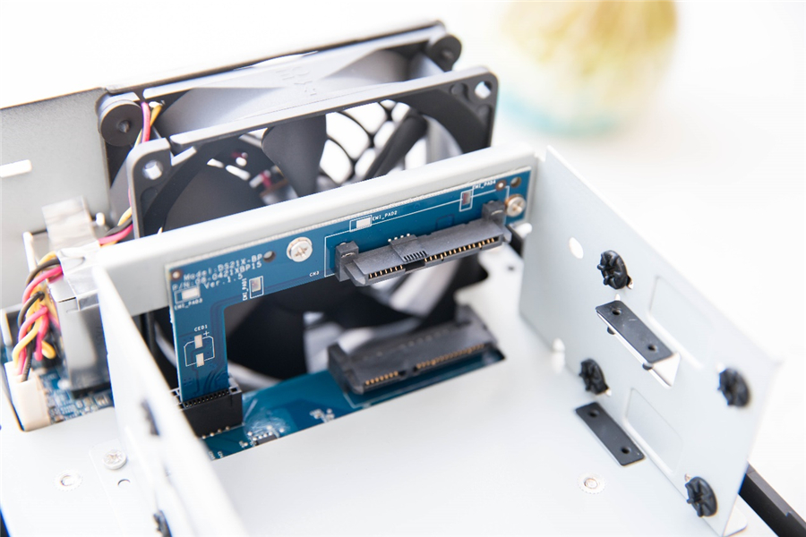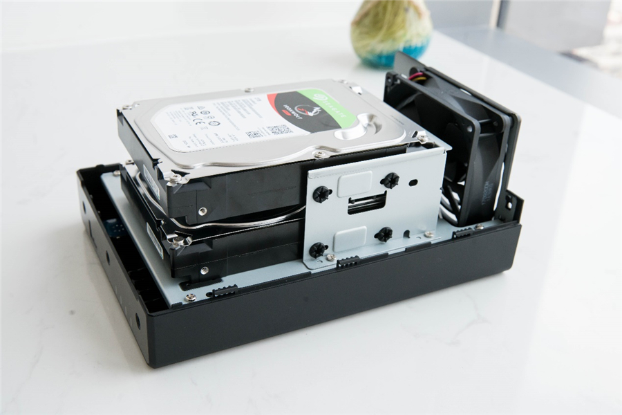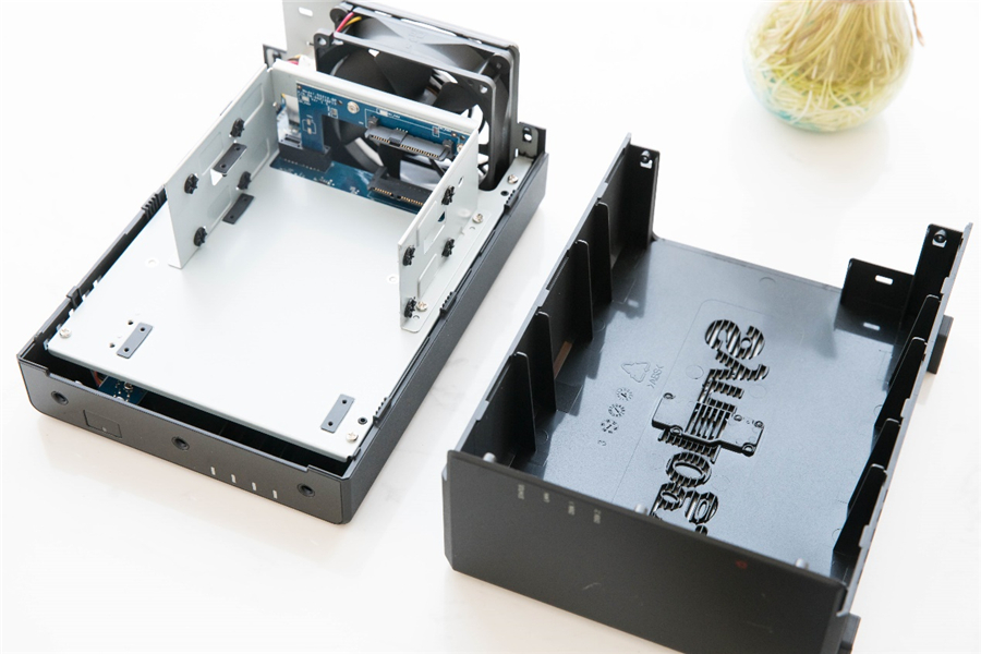 打開后可以看到內部做工精良,群暉在里面放置支持熱插拔的雙端口硬盤架。