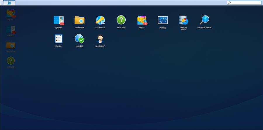 主菜單主要有11個大功能,分別為控制面板,File Station,EZ-Internet,DSM說明,套件中心,資源監控,存儲空間管理員,Universal search,日志中心,安全顧問,技術支持中心。