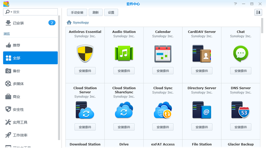 在“套件中心”可以安裝符合您需求的Synology 設計或第三方應用程序,如云共享文件、在線相冊共享照片、設置VPN環境和殺毒軟件以防護系統。可隨時在SynologyNAS 中免費套件安裝來開始使用。對于付費套件,需要注冊Synology帳戶,從而購買。