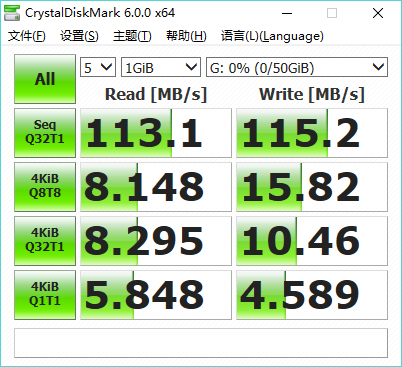 通過CrystalDiskMark得出NAS的寫入速度為115MB/s,讀取速度為113MB/s。