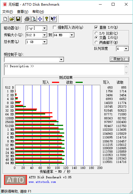 通過ATTO Disk Benchmark測試得出其讀取速度為114MB/s,其寫入速度為110MB/s。