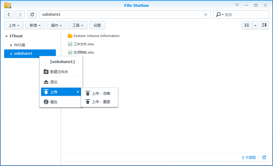 我們可以使用移動硬盤直接插在NAS背后,用電腦登陸DSM操作系統后,可以直接對移動硬盤進行操作,比如上傳整個移動硬盤的資料,你可以選擇“上傳—忽略”來使整個上傳為增量備份,所有重復文件不會再次復制,更加提升效率。