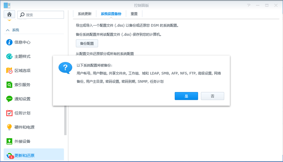 NAS的安全性能自然不用多說,而在控制面板中,用戶也可以選擇系統設置備份來備份所有資料。