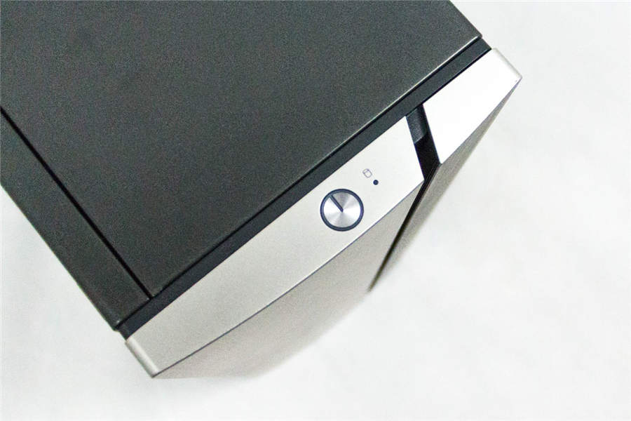 機箱的電源按鍵位于頂部前方。由于前面板I/O借口隱藏在了磁吸式翻門下,因此只有電源鍵得以單獨設置在外,與整體的商務極簡風格相得益彰。