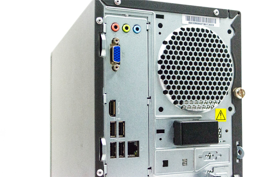 與此對應的,后置I/O接口的配備就豐富了一些。從上到下依次為3.5mm音頻接口,一個VGA接口,一個HDMI接口,兩個USB3.0接口,兩個USB2.0接口以及一個RJ45網口。可以看到,天逸510pro對于并沒有配備PS/2接口,因此對于老舊的鍵鼠設備并不兼容。