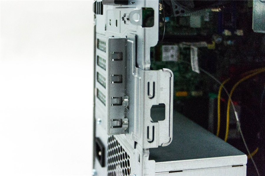 而第四個門則在另一邊。雖然本機并沒有配備獨立顯卡,卻為有需求的用戶預留了升級的空間。四個PCIe位擋板都是可徒手裝卸設計,掀開左側夾扣就可以自如拆裝,非常方便。