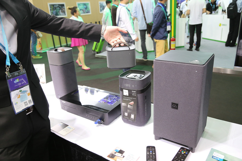 可以看到,前置揚聲器的頂部是可以拆卸的,低端便當盒樣子的部分便是后置揚聲器,其發生方向與下方不同,以此來構成空間聲場效果。另外,E6還采用了令人印象深刻的空間校準技術,以此來彌補揚聲器分布不均的問題。另外,可拆卸音箱可以作為獨立的藍牙音箱使用,這是非常有用的,你可以將它拆下放在臥室或是家中任何房間,兩個可拆卸音箱可組成一個藍牙立體聲播放系統。
