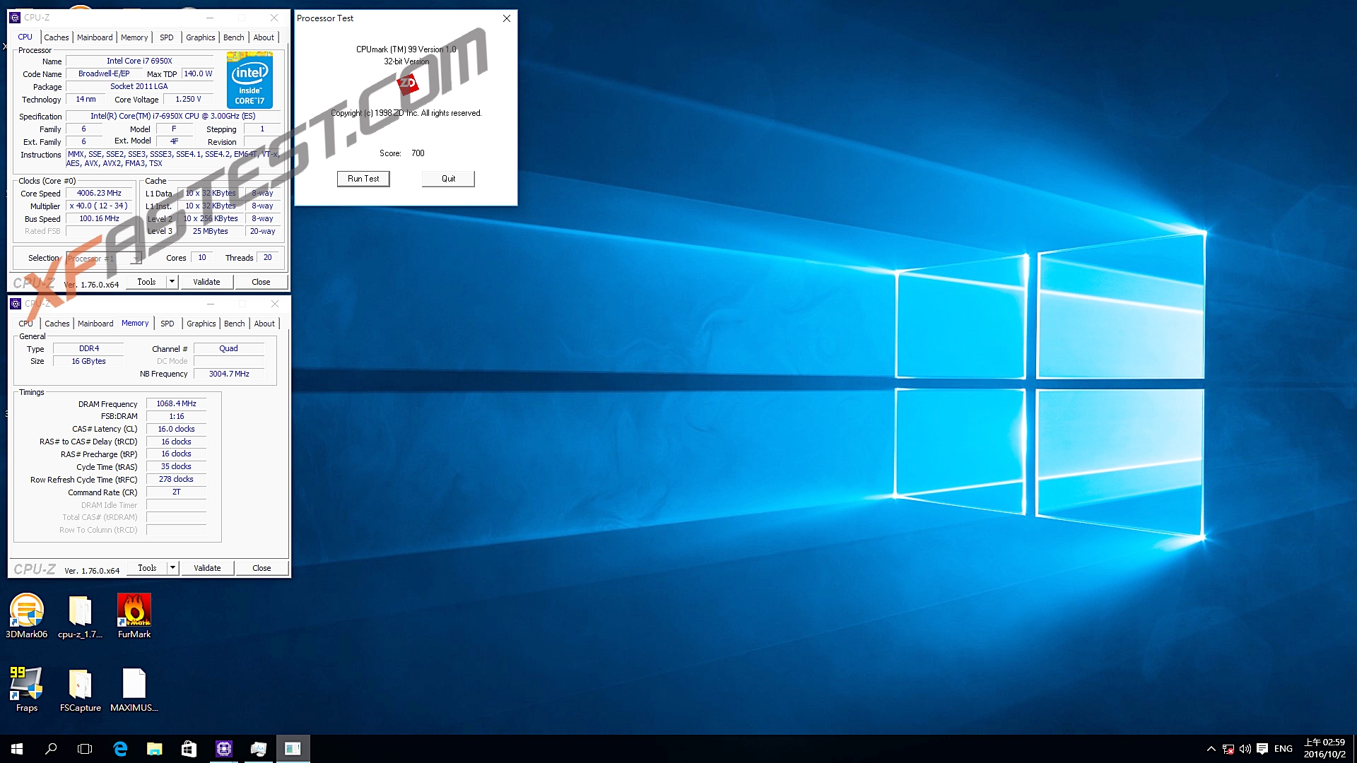 Intel i7-6950X 3.0GHz OC 4.0GHz 內存2133MHz效能測試CPUmark:700(i7-6950X 3.5GHz CPUmark:622 )