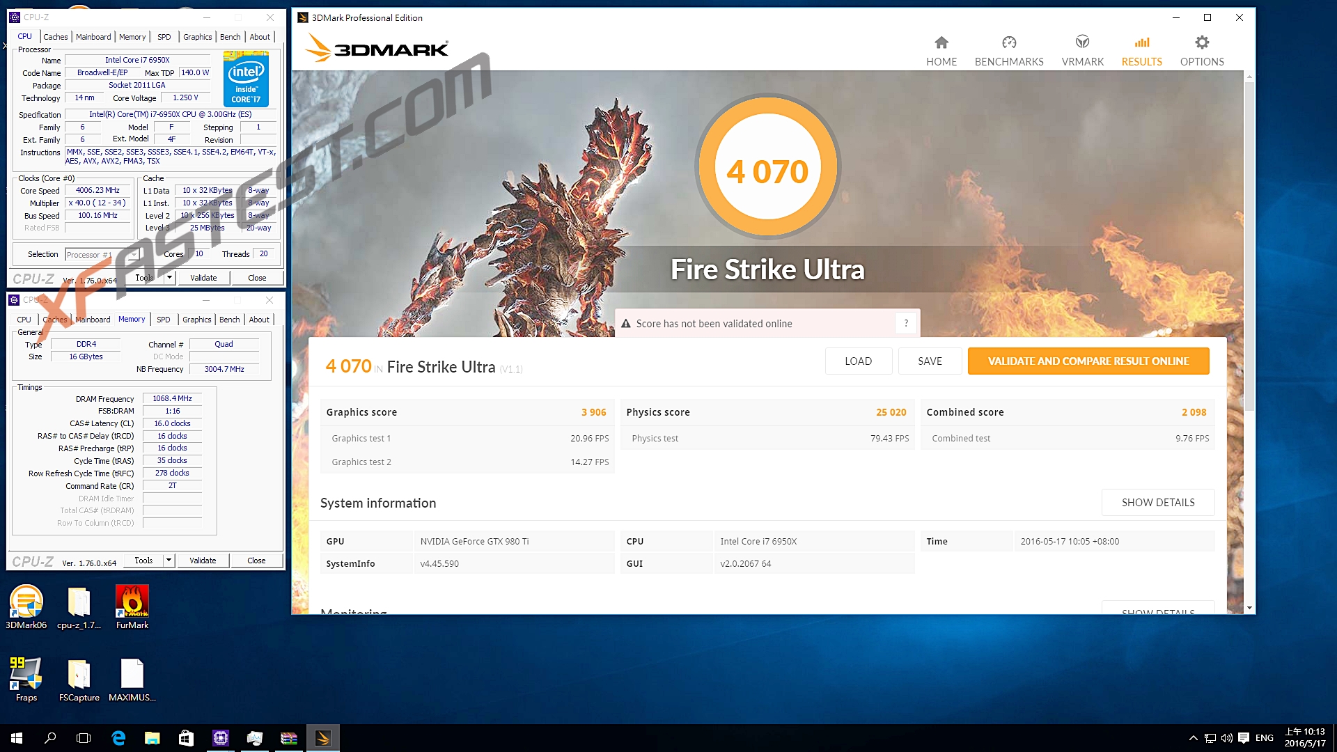 3DMARK Fire Strike Ultra 4070 Physics Score 25020(i7-6950X 3.5G PhysicsScore 22224)
