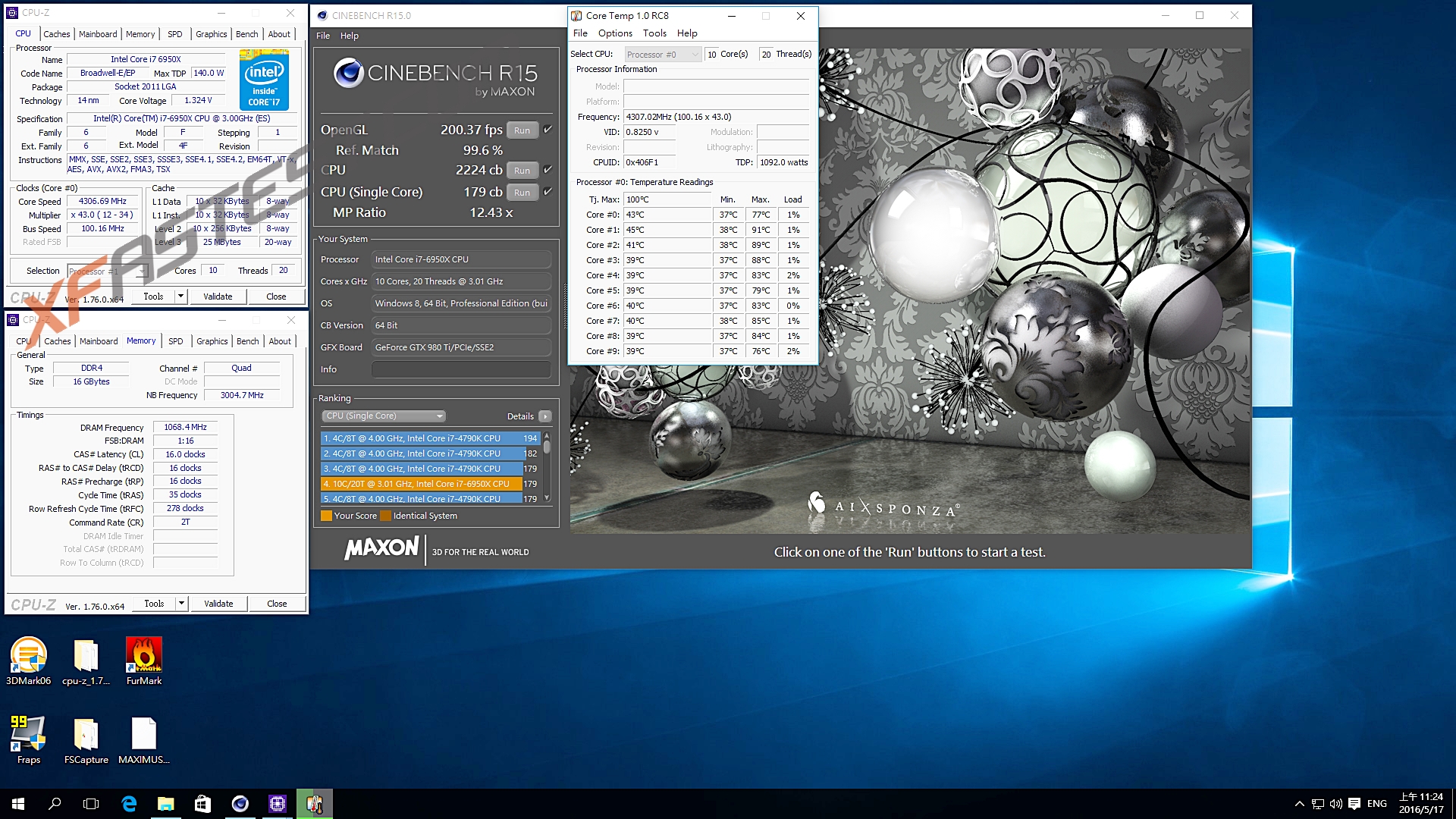 比較超頻前后,頻率相差0.5GHz的情況下,從CPUMark可以看到單核心效能成長11.8%,不過Skylake i7-6700K 4HZz的CPUMark為720,因此同頻率下i7-6950X的單核心效能是輸的,但相對的多核心i7-6700K就不是它對手,畢竟市場定位有點不同,至于CINBENCH R15多核心效能也有12%的成長,而3DMark Physics Score比較下也有12.6%的成長,個人覺得效能差異算是不錯,當然若是更前一代5960X相比那就贏更多了,只是i7-5960X的對手現(xiàn)在為i7-6900K才是。另外筆者測試使用的是Thermalright Silver Arrow IB-E Extreme空冷散熱器,可以看到上方的CINBENCH R15有附上CoreTemp溫度,3.5GHz落在55度上下,但超頻至4GHz后CINBENCH R15跑完最高溫度達75度,溫度相差約20度,因此想要玩超頻需要一顆不錯的空冷散熱器,且可以確定若要再往上超頻,除了CPU體質會有影響外,你的空冷將會成為關鍵之一。