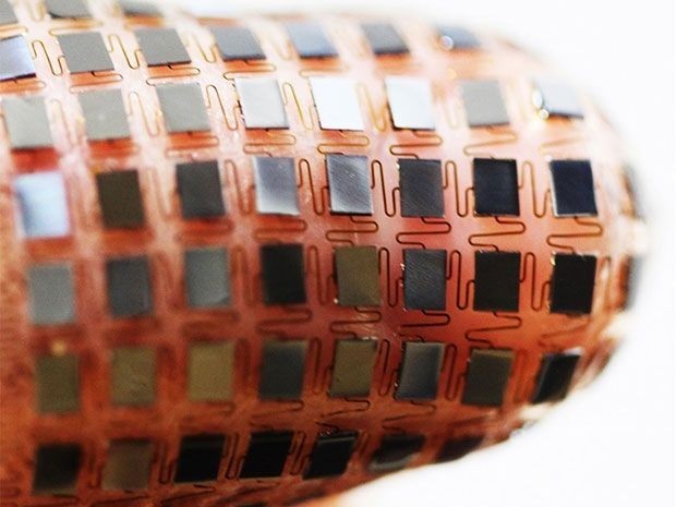 今天,在美國國家科學院院刊發布的新研究里,Rogers描述了他們設計最近的樣子:把用可伸展的太陽能電池電路連接起來的許多纖薄的、毫米級的固態鋰離子電池構成的數組放置在柔性基底上,然后折迭起來,這樣在最終的設備中太陽能電池板就能保證堆棧在電池之上。他用來演示這項新技術的設備是一個由熱敏組件和NFC無線模塊組成的可以測量和記錄溫度并且在必要時能將得到的數據傳送出去的設備,而電池組是它的一部分。Rogers的團隊測試的志愿者在騎行和洗澡的時候測試了這個設備。這個纖薄柔韌的電池可以在不影響太陽能發電性能的情況下伸展30%之多,Rogers表示這意味著用戶在使用的時候會幾乎感覺不到它的存在。