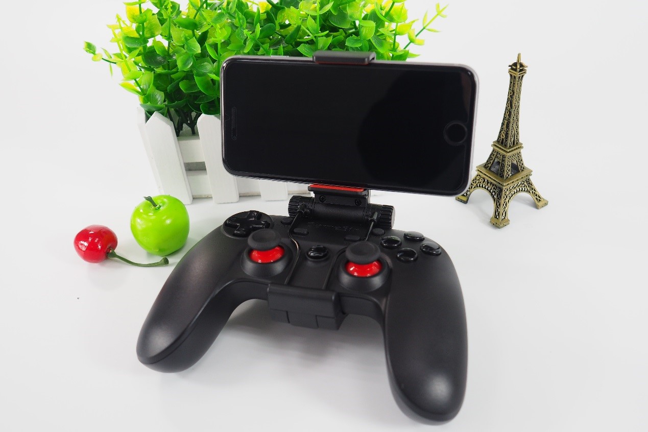 使用手機架連接手柄和手機,用起來還是不錯,角度可以自由調節,實測下來最大可以放進一個帶殼的Iphone6 plus,再大就不行了