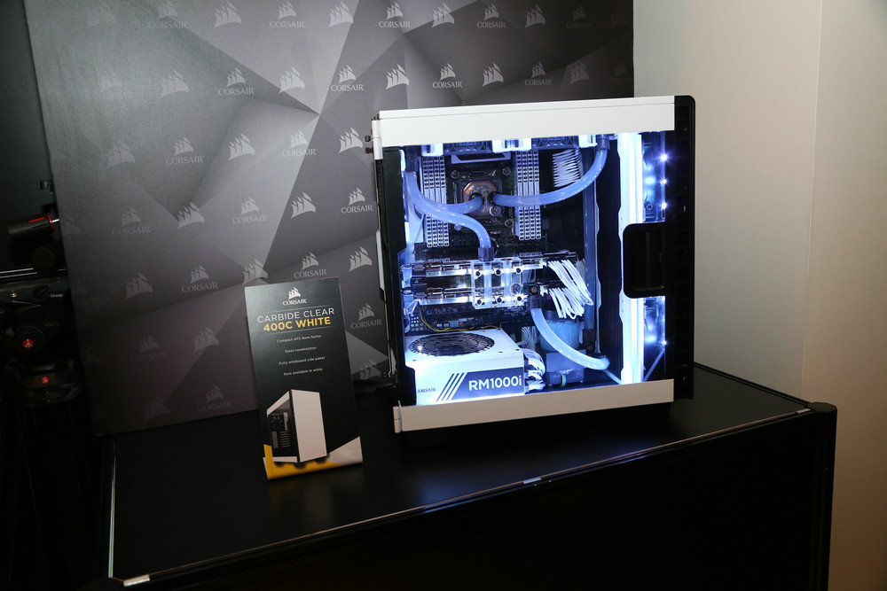 海盜船在現場展示的多款多彩風扇也成為了一大亮點,例如SP 120 RGB,HD120RGB,等多款風扇產品,全新的白色版400cc機箱,400C采用全透明亞克力把手設計,和海盜船760T設計如出一轍,可視化效果很好,布置LED燈條和強悍硬件一覽無余,而白色則更能襯托出色彩的魅力,想必喜愛DIY的玩家一定會愛不釋手。