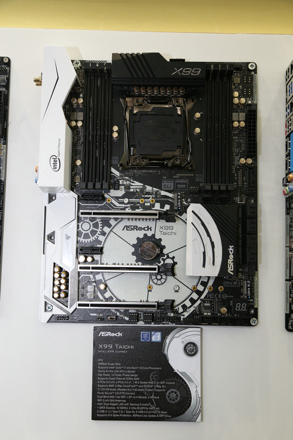要說全場最大的亮點也就在于這款全新的全新X99以及Hyper系列主機板,全新的X99TaiChi以嶄新的設計風格出現——太極,官方意在其可以剛柔并濟、從容不迫的對付每一道難關!如水般靜止、如風般無形、如鐵般堅硬!