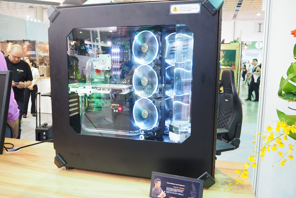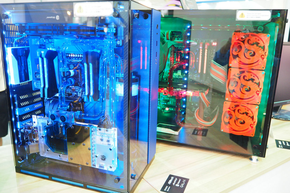 除此之外,現場還推出了幾款采用左右分流設計的機箱產品,機箱材料除了采用了鎂鋁合金之外,躋身前面板以及左側也采用了強化玻璃,相信許多DIY玩家已經自動腦補怎么組裝炫酷的機箱了吧!