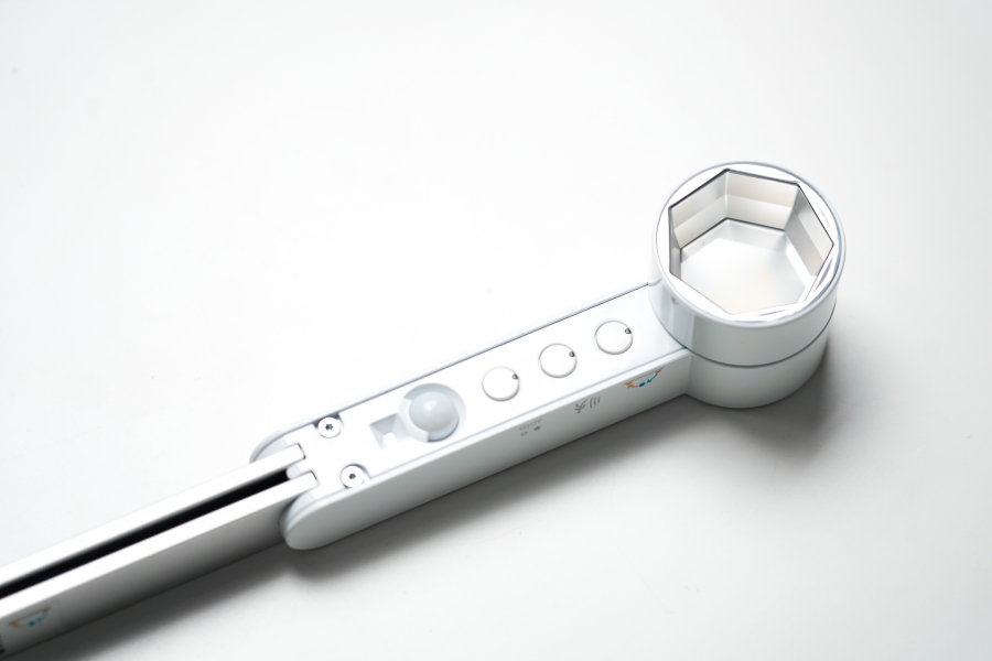 在燈臂的底部,除了擁有三顆功能按鍵,還有一個被動式紅外傳感器,這個傳感器能夠檢測到Lightcycle的周圍是否有人,如果你離開了以后忘記關燈也不用擔心,戴森Lightcycle會在你離開后兩分鐘自動關燈,當你再次靠近時則會自動開燈。這個功能可以說是拯救了我這樣的“出門忘關燈星人”了,經常下班回家發現自己的燈開了一整天。戴森Lightcycle直接幫我解決了這個問題,但是這個功能在我實際體驗時也有一個小問題,比如我在臺燈下專注于碼字的時候,動作幅度一般都比較小,常常會出現過了兩分鐘自動關燈的情況,不得不在工作的時候把這個功能關掉。不過也正因如此,你也可以將戴森Lightcycle放在床頭進行睡前閱讀,看書看累了不小心睡著的話它也能自動關燈。