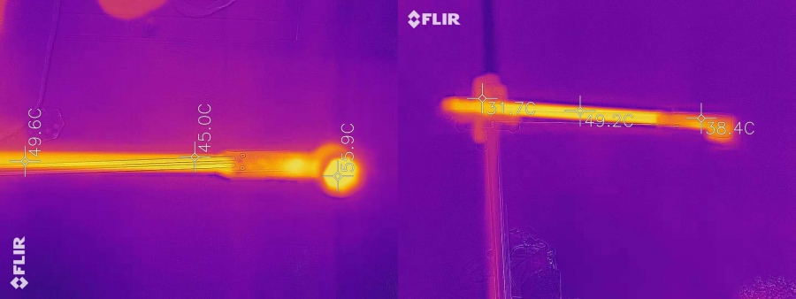 那么戴森Lightcycle的散熱效果究竟如何呢?在色溫最暖、亮度最高的狀態使用一個小時之后,我們通過熱成像儀分析它的表面溫度。可以看到燈頭內部的溫度達到了55.9度,戴森Lightcycle的燈頭內部溫度范圍是50-65攝氏度,根據色溫不同而變化。此外,由于燈頭表面是塑料材質,導熱性能并沒有金屬那么好,所以在燈頭的外部溫度僅為36.7度,燈臂的金屬部分溫度則超過了45度,并且由于金屬的導熱性能更強,摸起來會稍稍有些燙手。但畢竟燈具在長時間使用都會出現這樣的情況,所以也并不是什么大問題。