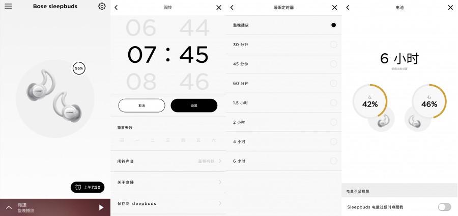 此外,在使用過程中還有一些細節(jié)的地方。通過Bose Sleep這個應(yīng)用,除了可以選擇不同的白噪音,調(diào)節(jié)音量,設(shè)置鬧鐘之外,還可以選擇睡眠定時,如果你只是因為噪音而感到入睡困難,那么選擇一小時左右的播放時間即可,如果你平時睡眠比較淺,容易被外界的聲音吵醒,那么我還是建議你開啟整晚播放比較好一些。