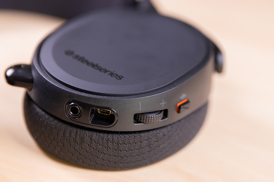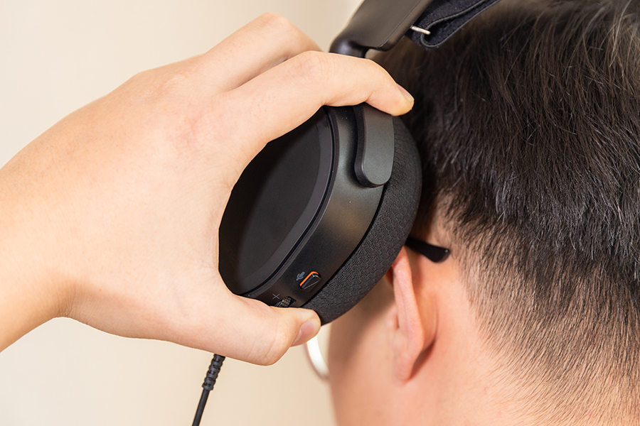 在左耳耳機底部的后方分布了這款耳機的各項接口和按鈕,從左到右依次為3.5mm耳機分享接口、耳機線轉接口、音量控制波輪以及麥克風靜音按鈕。