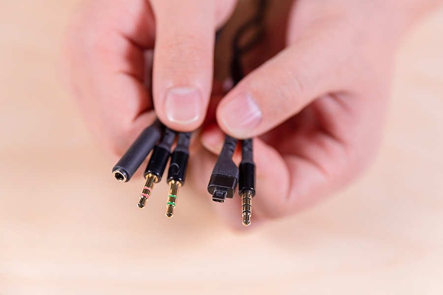 耳機標配了兩根線纜,分別為雙3.5mm三段式耳機麥克風插頭和通過轉換的單3.5mm四段式插頭。前者適用于家用PC主機的雙插應用,后者與各類移動設備的耳機接口相兼容。
