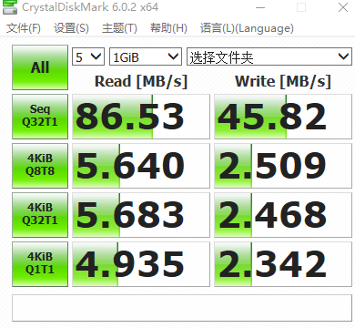 那既然插上電腦了,我就順帶測了一下USB3.0接口的讀寫速度。有圖有真相,用CrystalDiskMark軟件測出來的讀取和寫入速度分別為86.53MB/s和45.82MB/s。