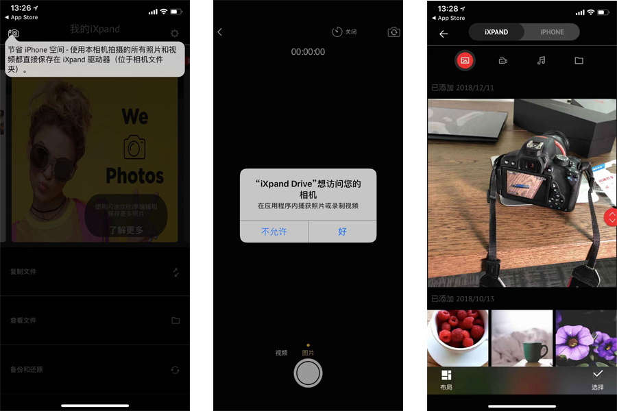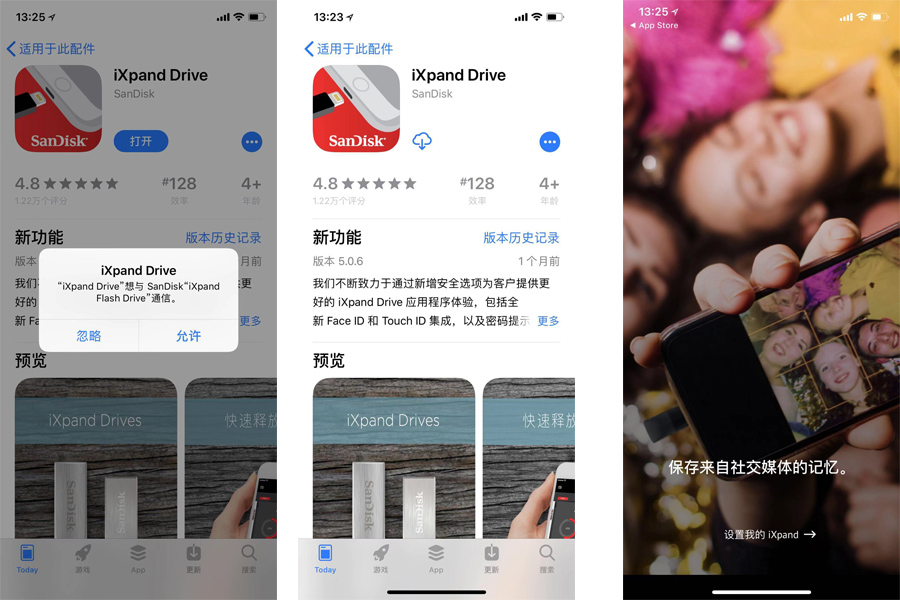之所以提到這個,是因為我在某電商平臺看到了閃迪欣享在iPhone X上不兼容甚至不能用的評論。那既然我有iPhone X,就偏不信邪,說干就干。注意,iOS系統下使用閃迪欣享需要安裝「iXpand Drive」,在欣享插入iPhone X提示識別后,點擊進入App Store安裝應用「iXpand Drive」(以下簡稱iXpand),依照步驟下載安裝成功后,進入iXpand應用界面,整個過程一氣呵成。