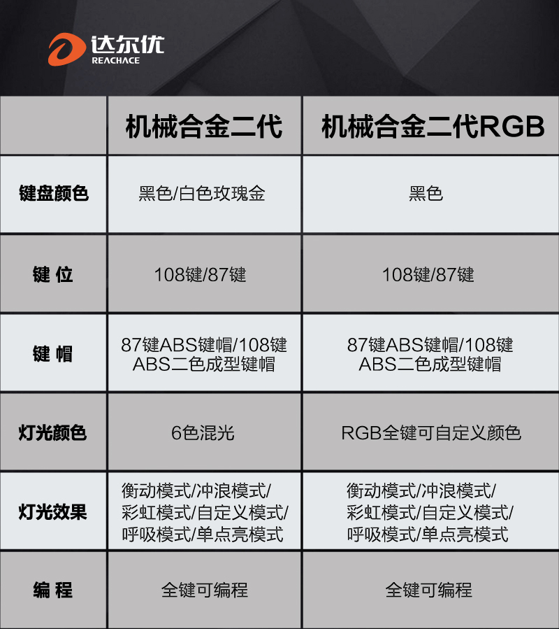 北京時間2016年1月12日,達(dá)爾優(yōu)發(fā)布機(jī)械合金(機(jī)械師)二代RGB版本,可全鍵自定義按鍵顏色,其余功能與普通版(混光)相同,具體對比如下: