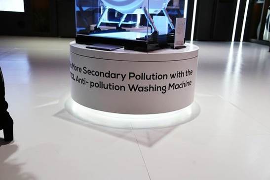 展臺上,除了搭配家居環境的整機外,展臺中央是TCL免污式滾筒洗衣機的內筒模型,意在讓參觀者更好的了解TCL免污技術,展臺墻壁和模型底座上都有“TCL免污式洗衣機避免二次污染”的英文標識。