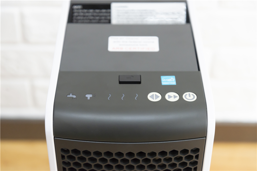 在EF AP-360空氣凈化器的頂部,也能夠看到幾顆狀態(tài)指示圖標。左側(cè)是濾網(wǎng)清潔指示燈,中間是風速調(diào)整以及強風模式,最右側(cè)則是電源。