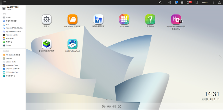 目前威聯(lián)通TS-532x運(yùn)行的是QTS 4.3.6系統(tǒng),系統(tǒng)簡潔精致,使用起來也更加簡單快捷。在進(jìn)入系統(tǒng)之后我們可以看到系統(tǒng)主頁面有控制臺、File Station文件總管、存儲與快照總管、App Center等應(yīng)用,這些都是用NAS時必備的功能。