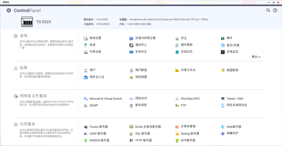 控制臺包括了系統(tǒng)、權(quán)限、網(wǎng)絡(luò)&文件服務(wù)以及應(yīng)用服務(wù)四個方面的設(shè)置,許多最基礎(chǔ)常規(guī)設(shè)置如系統(tǒng)更新、網(wǎng)絡(luò)設(shè)置以及權(quán)限的管理都可以在這邊直接進(jìn)行設(shè)置。