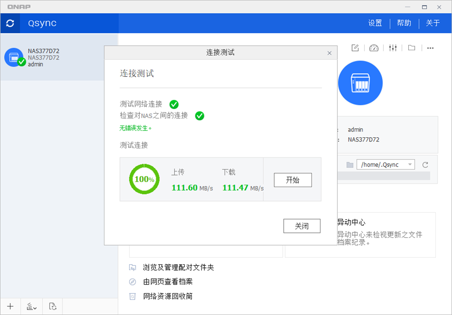 在開啟Qsync之后我們可以在電腦上直接下載客戶端,打開客戶端后搜索連接NAS后,本地會出現(xiàn)Qsync文件夾,你可以在這次文件夾放入的文件都可以自動同步到File Station文件總管的Qsync文件中,并且同步速度相較于普通網(wǎng)盤都更快,QNAP官方的連接測試上傳可達(dá)111.6MB/s,下載則為111.47MB/s。