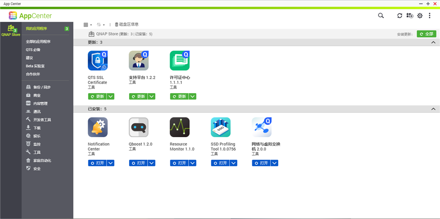 在App Center中,你可以下載諸多應(yīng)用,實(shí)現(xiàn)NAS的種功能。這里就像是NAS的藏寶庫,里面的應(yīng)用程序可以幫你使NAS實(shí)現(xiàn)更多的個性化功能。經(jīng)過不斷地完善發(fā)展,威聯(lián)通的App Center里的應(yīng)用程序生態(tài)已經(jīng)較為完善,根據(jù)精細(xì)的分類推薦我們也可以很快地找到我們所需要的應(yīng)用。
