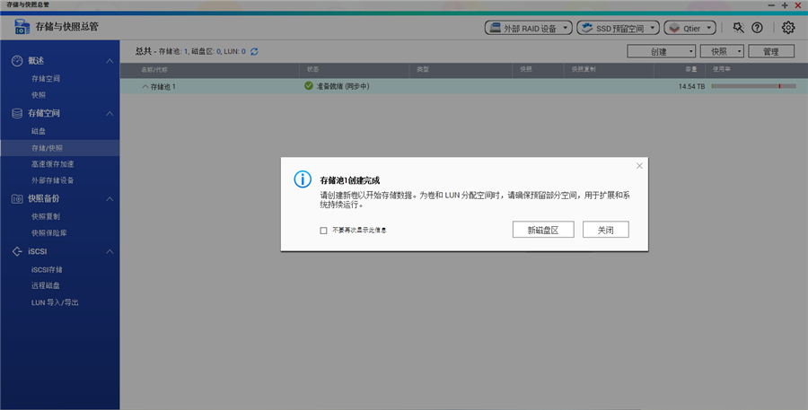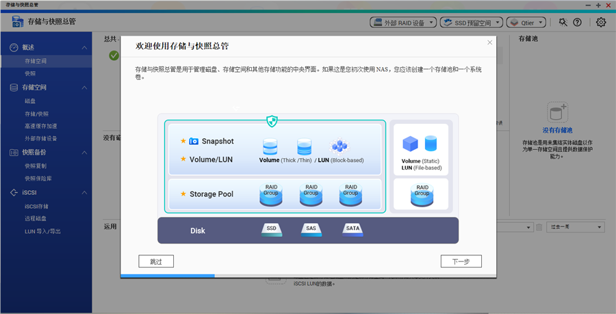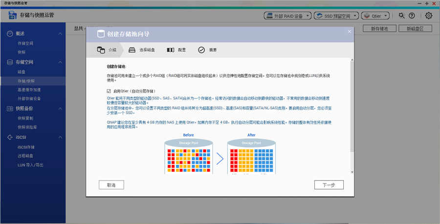 接下來我們就進(jìn)入存儲與快照總管,在進(jìn)入之前QNAP有較為詳盡的講解說明,可以讓小白用戶更加了解系統(tǒng)功能,十分地友好。在存儲與快照總管功能中我們需要先建立存儲池,在建立存儲池時我們可以選擇是否開啟Qtier自動分層存儲技術(shù)。
