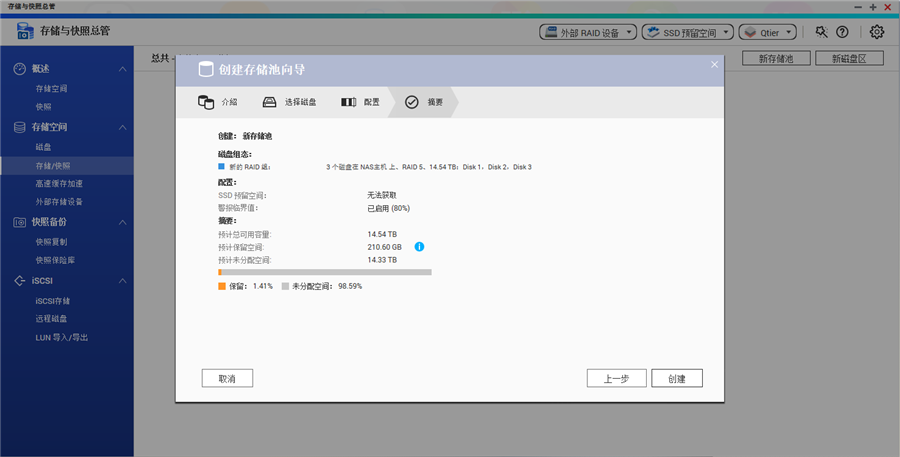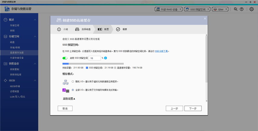 最后我們將三個HDD組建了RAID 5陣列的存儲池,在存儲池組建完成后我們建立一個2.86TB的磁盤區(qū)。不過目前磁盤上還有兩個SSD,這正好可以讓我們創(chuàng)建QNAP的SSD高速緩存加速功能。它支持預(yù)留一部分SSD空間(最多預(yù)留60%)以此來大幅提升SSD隨機(jī)寫入性能并延長SSD壽命。