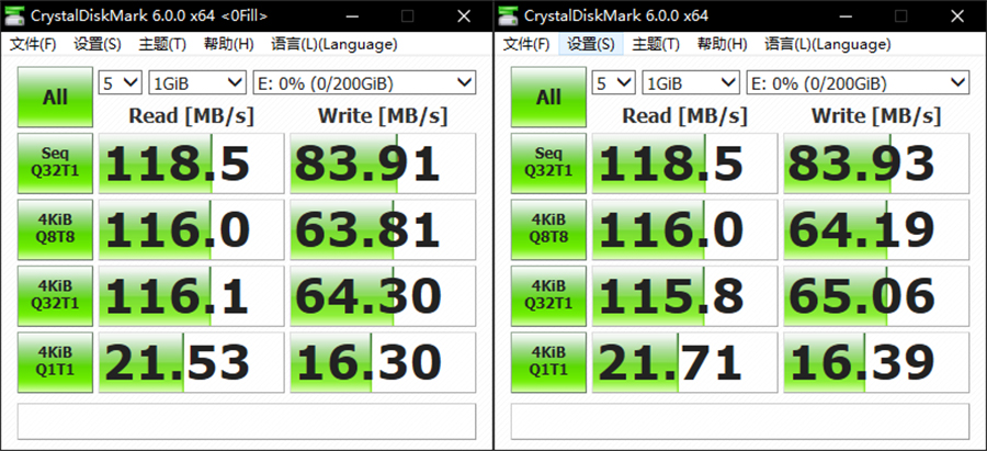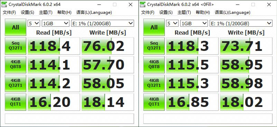 通過CrystalDiskMark,我們可以測試得出它在默認(rèn)隨機(jī)模式以及全零可壓縮狀態(tài)模式下的讀取速度可以達(dá)到118MB/s,而寫入速度則是能夠達(dá)到89MB/s。