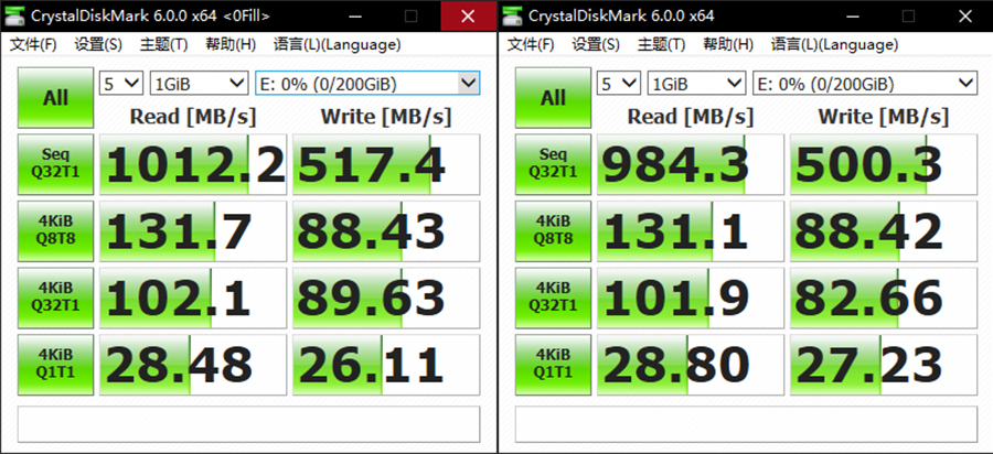 在接入萬兆網(wǎng)絡(luò)之后,我們再用CrystalDiskMark測試它在默認(rèn)隨機(jī)模式以及全零可壓縮狀態(tài)模式下的讀取速度,可以看到讀取速度已經(jīng)被提升到1000MB/s,寫入速度也達(dá)到500MB/s,已經(jīng)超過了普通的SATA協(xié)議固態(tài)硬盤,相較于之前測試的結(jié)果也有了巨大幅度的提升。