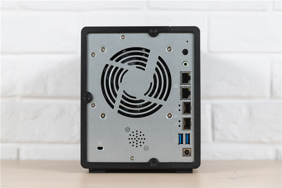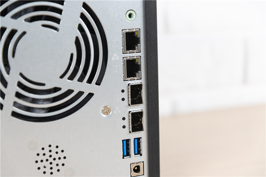 在威聯(lián)通TS-532x的背面,我們可以看到除了兩個USB接口、電源、音頻接口之外,還有兩個RJ45和兩個10GbE SFP+接口。所以不要小看這臺NAS,有了10GbE的SFP+接口,再加上網(wǎng)絡(luò)交換機(jī),那么它就能夠輕松達(dá)到萬兆速度。