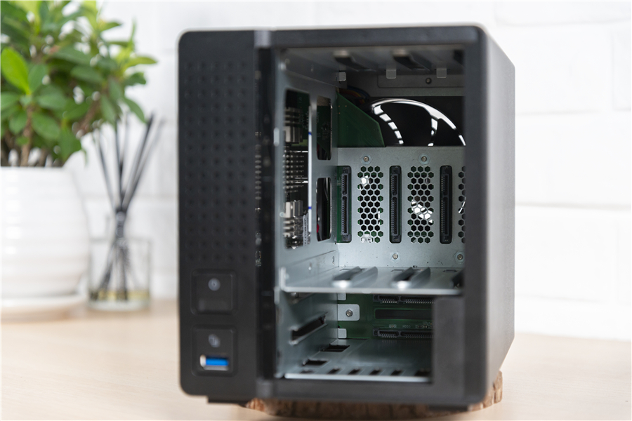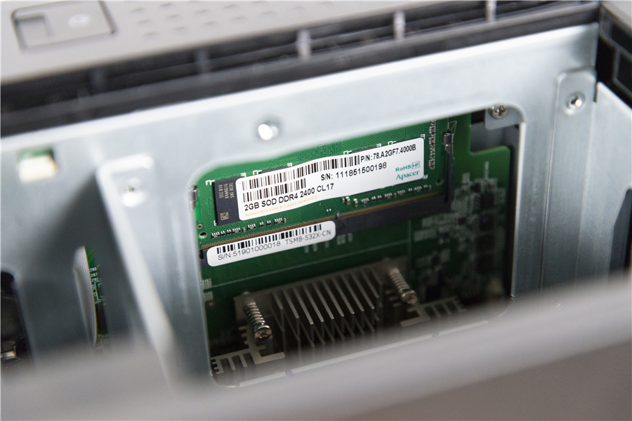 將NAS的外殼拆下之后,我們可以看到這款NAS的做工還是較為扎實(shí)的,它的整體框架也是采用金屬鋁制成,既能夠減輕整機(jī)的重量也有利于散熱。我們也能夠看到這款NAS的內(nèi)存為2GB的DDR4內(nèi)存,如果你感覺不夠用那么可以升級到16GB。