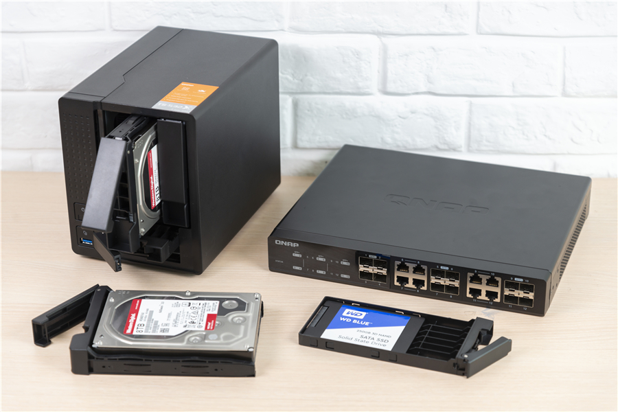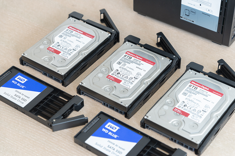 接下來我們就實(shí)際使用體驗(yàn)一下威聯(lián)通TS-532x。首先是硬盤的選擇,我們選擇了3塊西部數(shù)據(jù)8TB紅盤以及2塊250GB西部數(shù)據(jù)藍(lán)盤,西部數(shù)據(jù)紅盤支持NASware技術(shù),可以實(shí)現(xiàn)7×24小時不間斷運(yùn)作,具有超強(qiáng)的穩(wěn)定性,是在使用NAS時的不二之選;而西部數(shù)據(jù)藍(lán)盤采用64層3D NAND閃存顆粒,擁有更低的功耗與更快的讀寫性能,也十分適合用在NAS上。