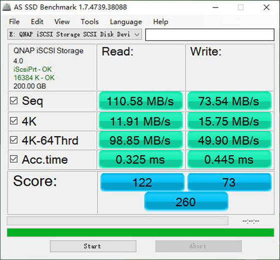 可以看到,威聯(lián)通TS-532x即使在同時連接萬兆網(wǎng)與千兆網(wǎng)也能夠有著十分不錯的速度表現(xiàn),與之前并無太多差異。