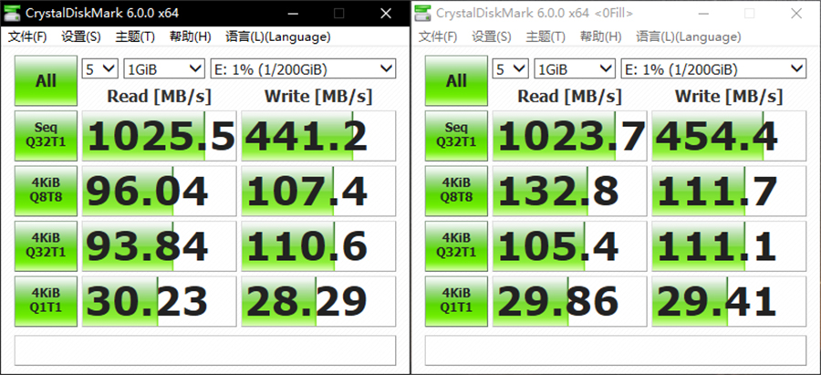 連接10GbE的SFP+網(wǎng)絡(luò)的電腦,運(yùn)行CrystalDiskMark測試虛擬硬盤在默認(rèn)隨機(jī)模式以及全零可壓縮狀態(tài)模式下的讀取速度,可以看到讀取速度保持在1000MB/s以上,寫入速度也達(dá)到450MB/s左右。