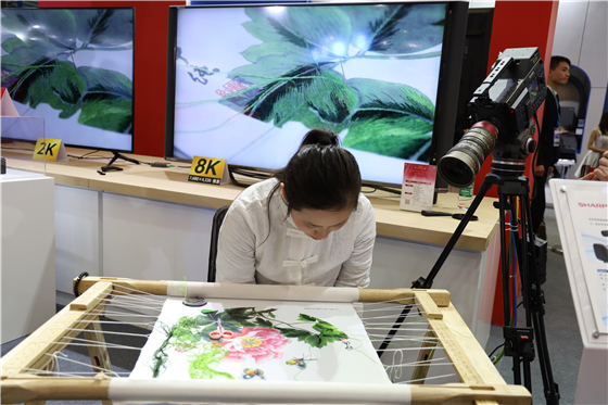 在現場,夏普直接以8C-B60A為我們演示了8K分辨率的刺繡表演現場直播。配合夏普的8K電視,細節纖毫畢現,畫面解析力極其強悍。