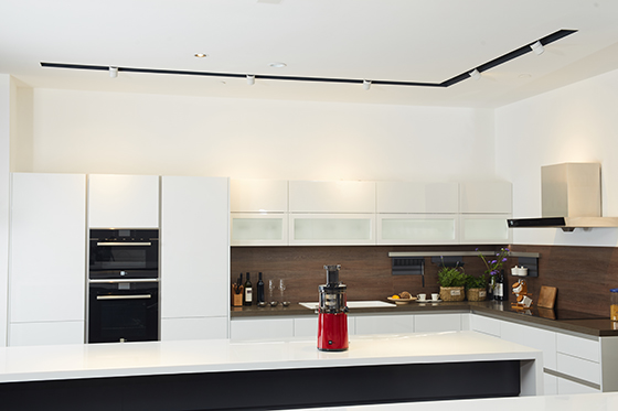 在米技的展區(qū)的爐具鍋具烤箱等廚具用品外型相當(dāng)?shù)木碌溲?,而且整體智能廚房展區(qū)的展廳設(shè)計(jì)和廚具擺放也十分考究,盡顯高端氣息。