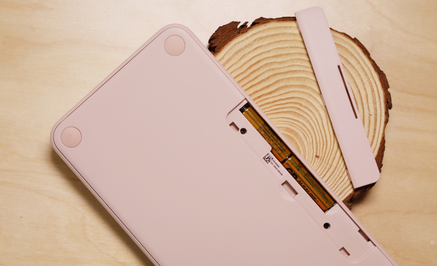 整個機身采用工程塑料材質,加入啞光設計,在鍵盤正面上方居中位置以及背部最下放分別印有羅技和K380的logo。不過,雖然機身采用啞光磨砂面設計,但還是會有一定概率留下指紋,不過好在我手中的K380是茱萸粉配色,顏色較淺,指紋痕跡也就不那么明顯。如果是像黑色或者是藍色這樣較深的配色,可能就需要用戶定期清理來保持潔凈了。