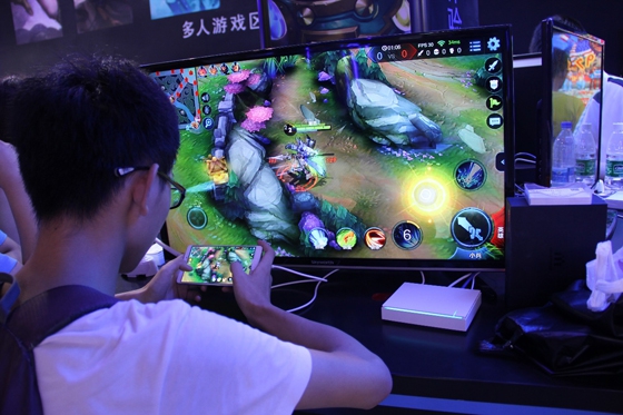 創維微游戲機的最大特點莫過于跨屏功能,它能夠實現“從小玩到大”,從小屏幕向大屏幕的跨越,從手游玩到電視大屏,分享快樂。只需要下載miniStation手機端APP,游戲畫面就完全跨屏到了手機上,不僅如此,所有操作都可以在手機上進行,非常方便,而且操作起來幾乎沒有延遲。看!現場觀眾玩得多投入。