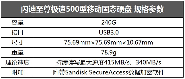 小編手上的這款閃迪至尊極速500型移動固態硬盤容量為240GB,從數據參數上來看(見下圖)這款產品的的體積十分小巧,而且重量僅為78.9克,十分便攜,而最大的持續讀寫速度達到415MB/s、340MB/s,要比傳統的移動硬盤快上4倍之多,并且同時支持Windows系統和MAC OSX系統 。